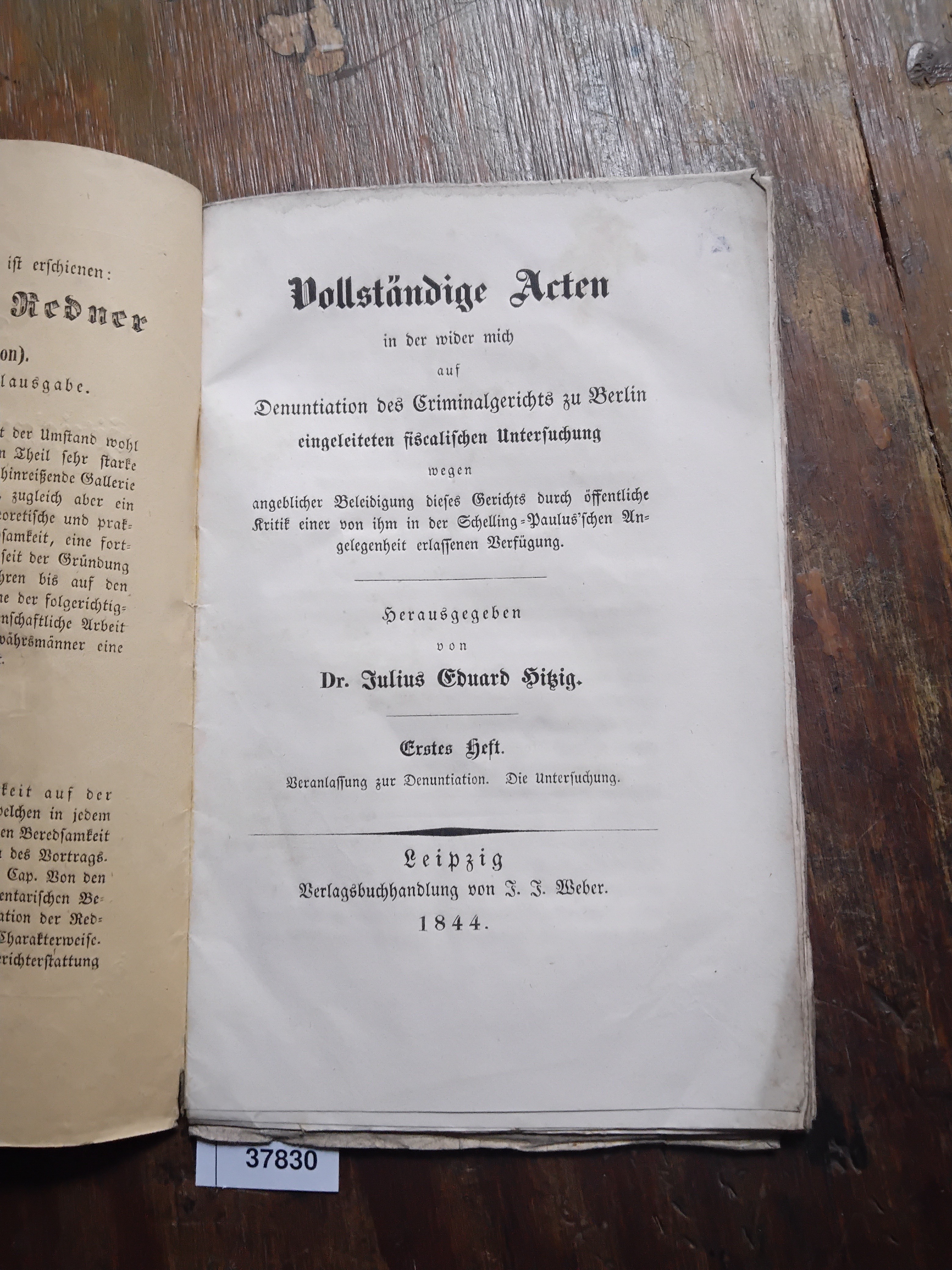 Vollständige Acten in der wider mich auf Denunciation des Criminalgerichts zu Berlin eingeleiteten Untersuchung wegen angeblicher Beleidigung dieses Gerichts durch öffentliche Kritik einer von ihm in der Schelling-Paulussche Angelegenheit erlassenen Verfügung Erstes Heft Veranlassung zur Denuntiation. Die Untersuchung