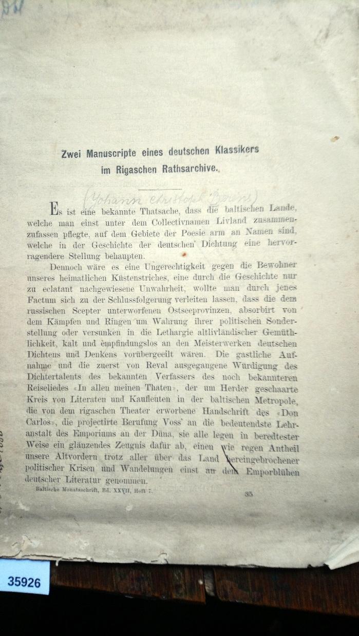 Zwei Manuscripte eines deutschen Klassikers im Rigaschen Rathsarchive |